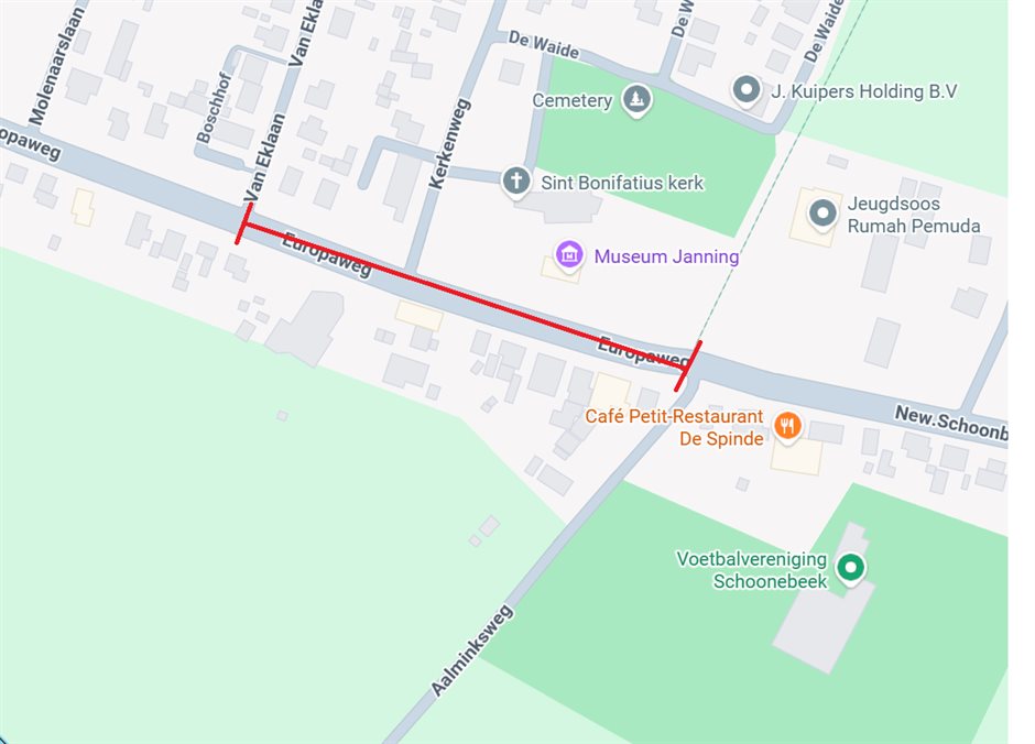 Vanaf 19 december om 16.00 uur gaat de rijbaan van de Europaweg weer open tot aan de kruising met de Aalminksweg. Het asfalt is daar nieuw.