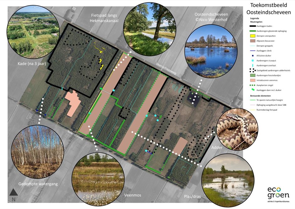 In de zomer van 2022 zijn verschillende agrarische gronden aangekocht die worden gebruikt om het natuurgebied te verbeteren. Hoogveen heeft water nodig om te blijven bestaan. Daarom willen we regenwater langer vasthouden in het gebied. Dit doen we door sloten dicht te maken (dempen) en kades aan te leggen. Elke kade vormt een peilvak, waar we het waterpeil reguleren middels een stuwput. Hierdoor voorkomen we verdere oxidatie en inklinking van de bodem.